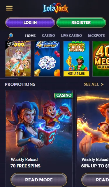 The casino Lolajack lobby covers all the major categories you would want from a full-service operator, with thousands of titles depending on your region. Slots make up the bulk of the catalogue, but live dealer, table games and jackpots are all well represented and easy to find through the top navigation. Slot contribution to wagering sits at 100% on most titles, live games contribute around 10%, and jackpots are usually excluded from bonus play.